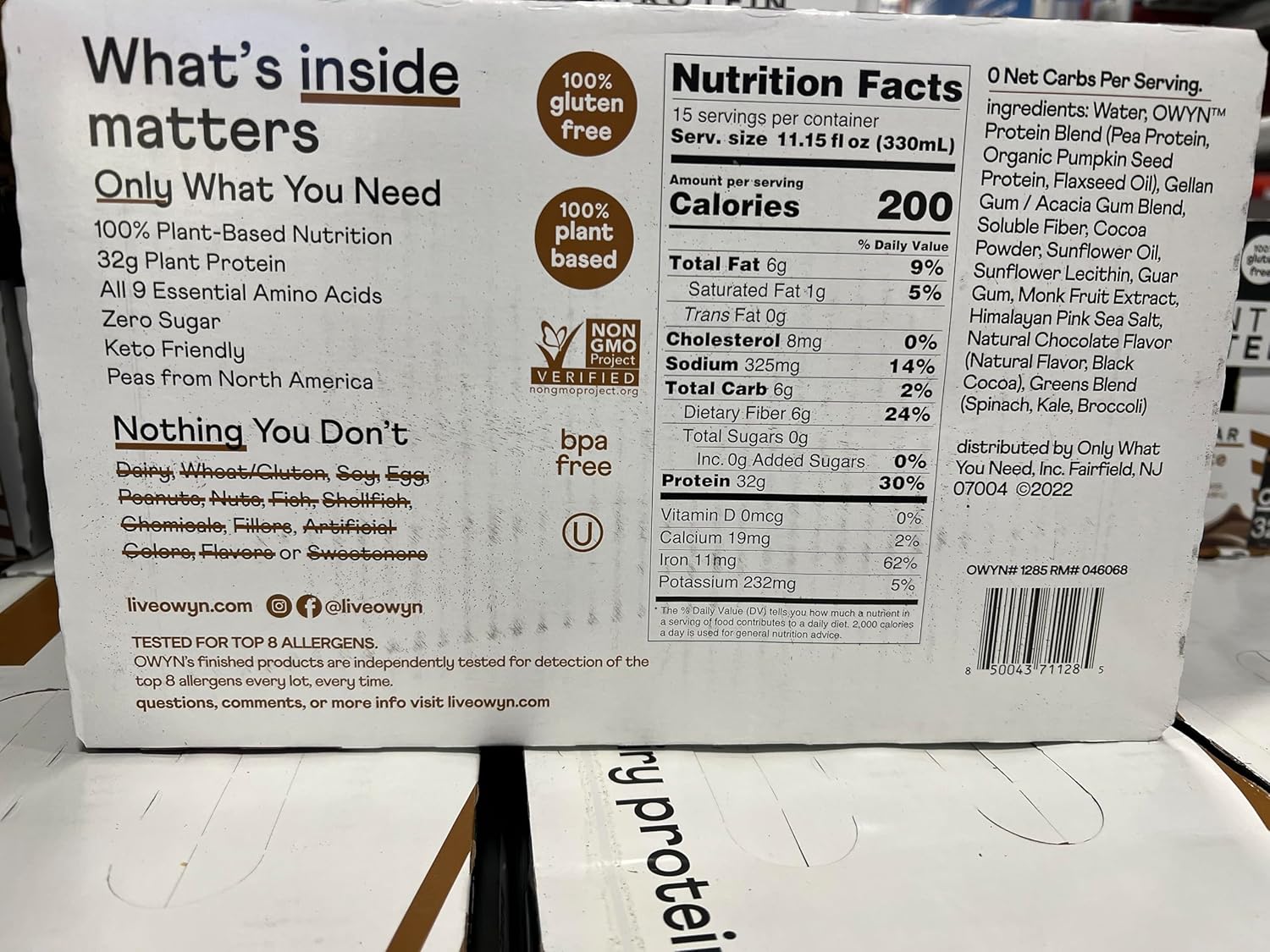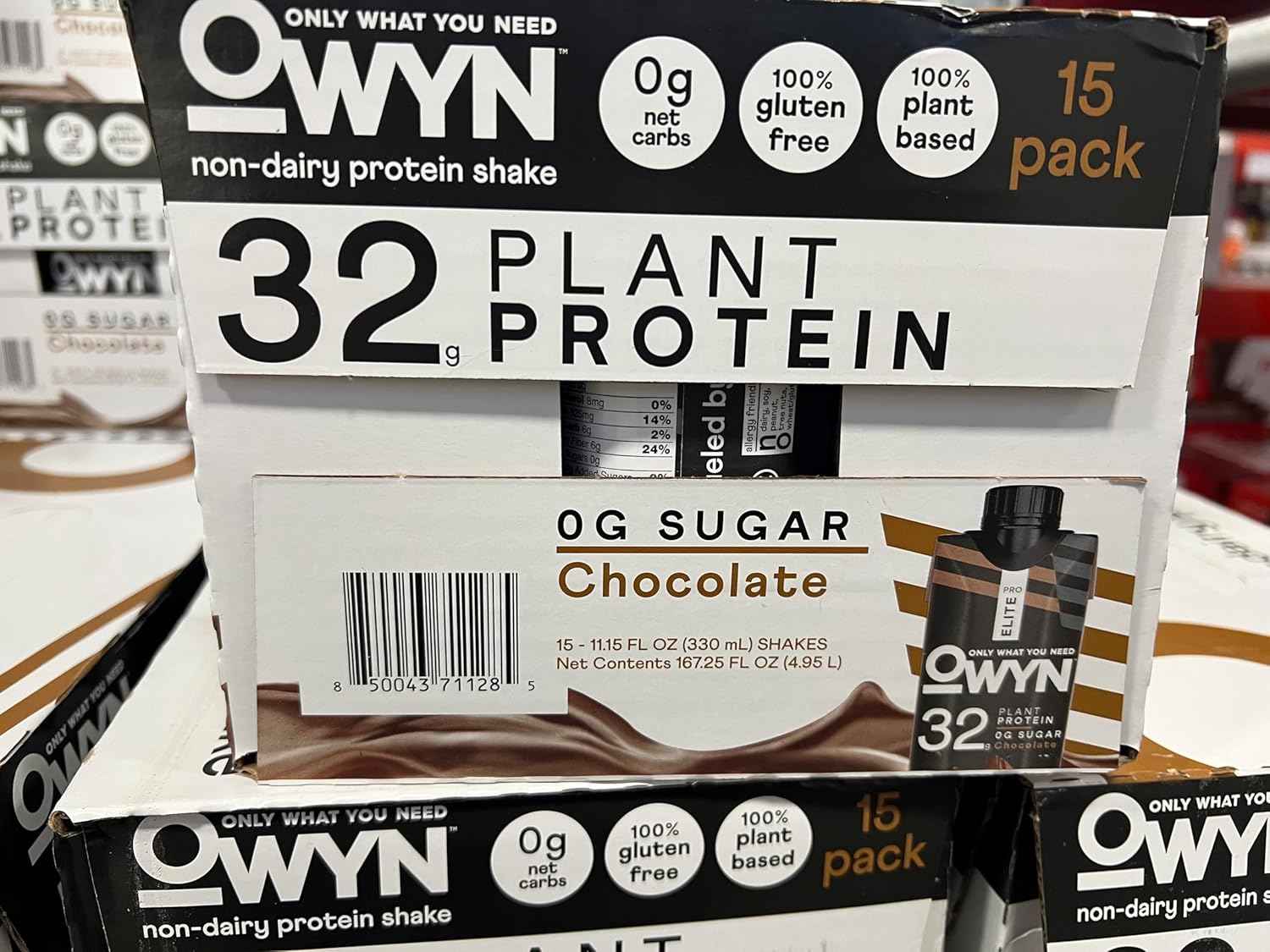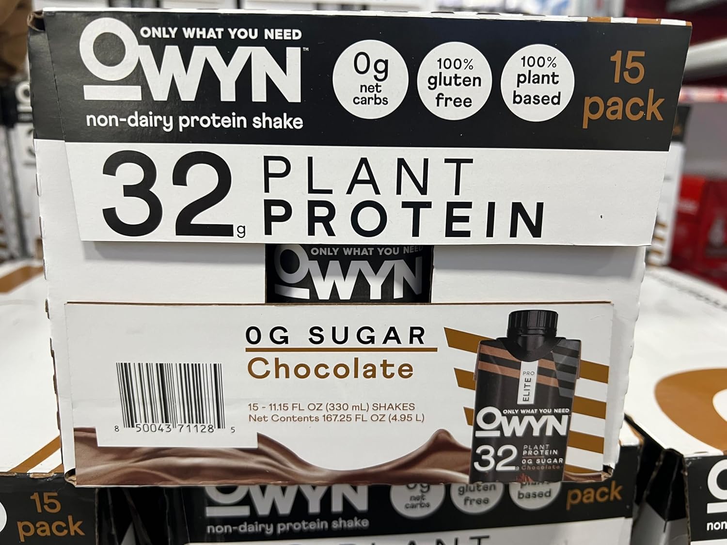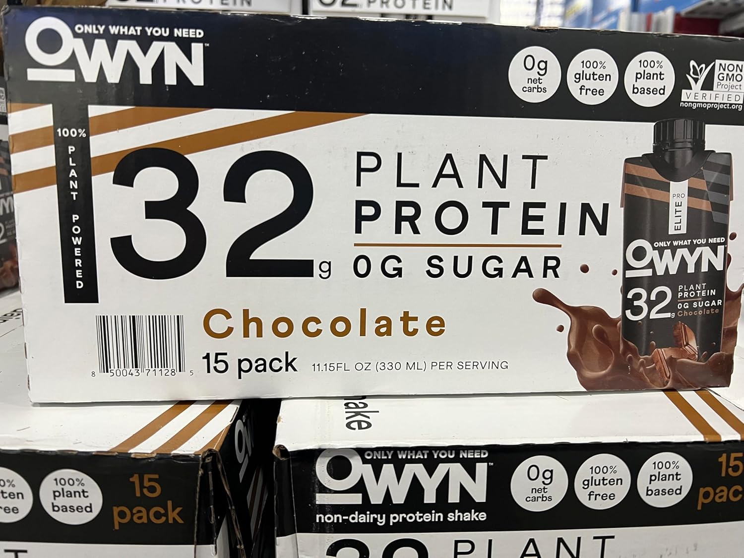 OWYN Plant Protein Elite Pro 32g – Chocolate is a plant-based protein shake that delivers 32 grams of protein per bottle, with 0g sugar and 0g net carbs. It is gluten-free and comes in a 15-pack of 11.15 fl oz (330 ml) bottles.
